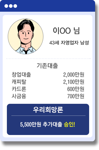 만 20세이상 고객 대상으로 개인신용평점 등 신용도 및 당사 평가기준에 따라 대출 가능 여부 및 이자율 산출. 단 채무불이행 등록자는 제외 |이자는 매월 약정일에 부과하고, 상품에 따라 원금자유상환(만기일시상환), 원리금균등분할상환 등의 방법으로 상환|연체금리 : 약정이자율+3%P이내, 연20%이내.
